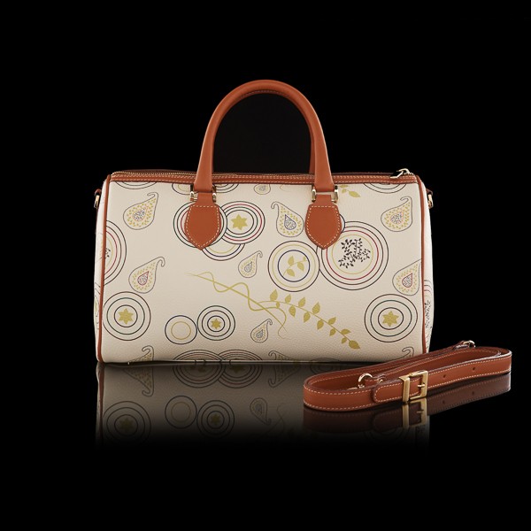 Color:fondo arena y estamado de colores,piel de asas, remates y bandolera en marrón e hilo en beige